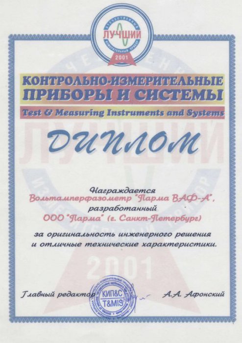 Диплом "За оригинальность инженерного решения ПАРМА ВАФ-А"