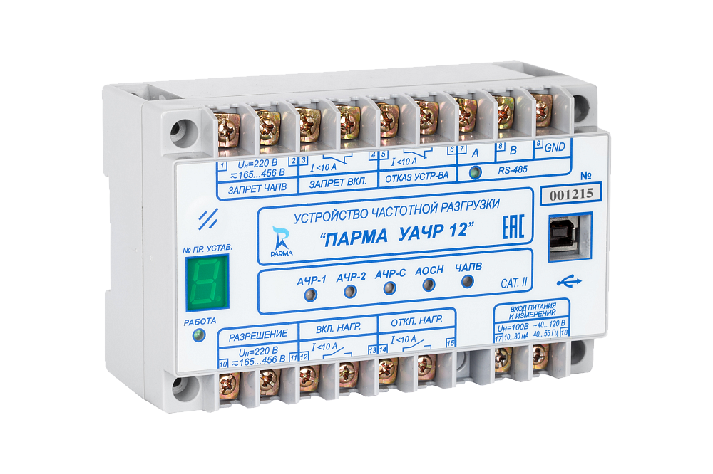 ПАРМА УАЧР 12 — это первое в России микропроцессорное устройство частотной разгрузки, получившее сертификат соответствия требованиям стандарта АО «СО ЕЭС» (СТО 59012820.29.020.003-2016) и подтвержденное сертификатом № NC11.SO.RU.0417.0001. Устройство может заменить традиционные схемы частотной разгрузки на базе реле, такие как РСГ-11, РЧ-1, РЧ-2 и УРЧ-ЗМ, обеспечивая при этом надежную и высокоинформативную защиту.